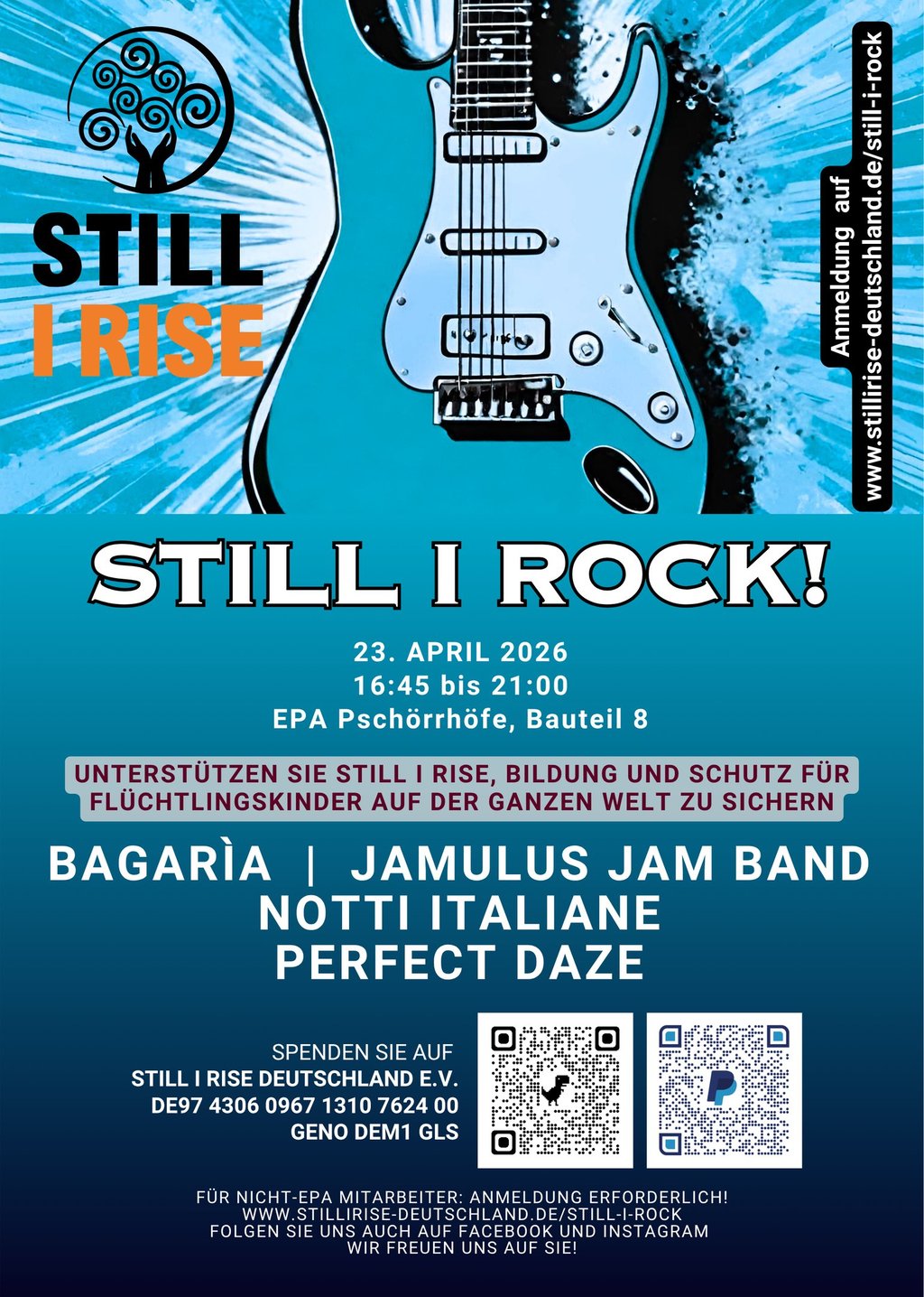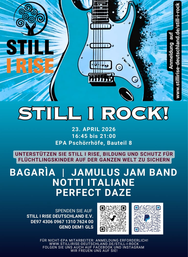 Am 10. April 2025 verwandelte sich das Europäische Patentamt in eine Bühne für Solidarität und Rockmusik: Beim Benefizkonzert Still I Rock! kamen vier fantastische Rockbands zusammen, um gemeinsam ein starkes Zeichen für Bildung und Gerechtigkeit zu setzen – und die Arbeit von Still I Rise zu unterstützen.