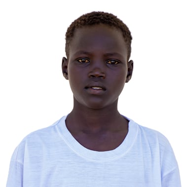 Puol: Ein 12-jähriger Junge aus Südsudan, der in einem Lehmhaus mit Strohdach zusammen mit neun Familienmitgliedern lebt, darunter acht Kinder. Das Zweiraumhaus hat weder Wasser noch Strom und verfügt nur über eine geteilte Toilette. Puol ist sozial, ruhig und diszipliniert und hat eine Leidenschaft für Fußball.